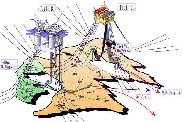 It reaches the sea floor, 303 metres below the surface of the Norwegian Sea. Gas rises from 40 wells, and is exported through a number of pipes. Its height is 472 meters and it weighs 656,000 tons! It was the tallest structure ever moved. The base and the deck were built separately (starting in 1991-1992). They were joined while the base was partially submerged. The Troll platform was towed over 200 km from Vats in Nord Rogaland to the Troll field, 80 km north-west of Bergen. The tow took 7 days.